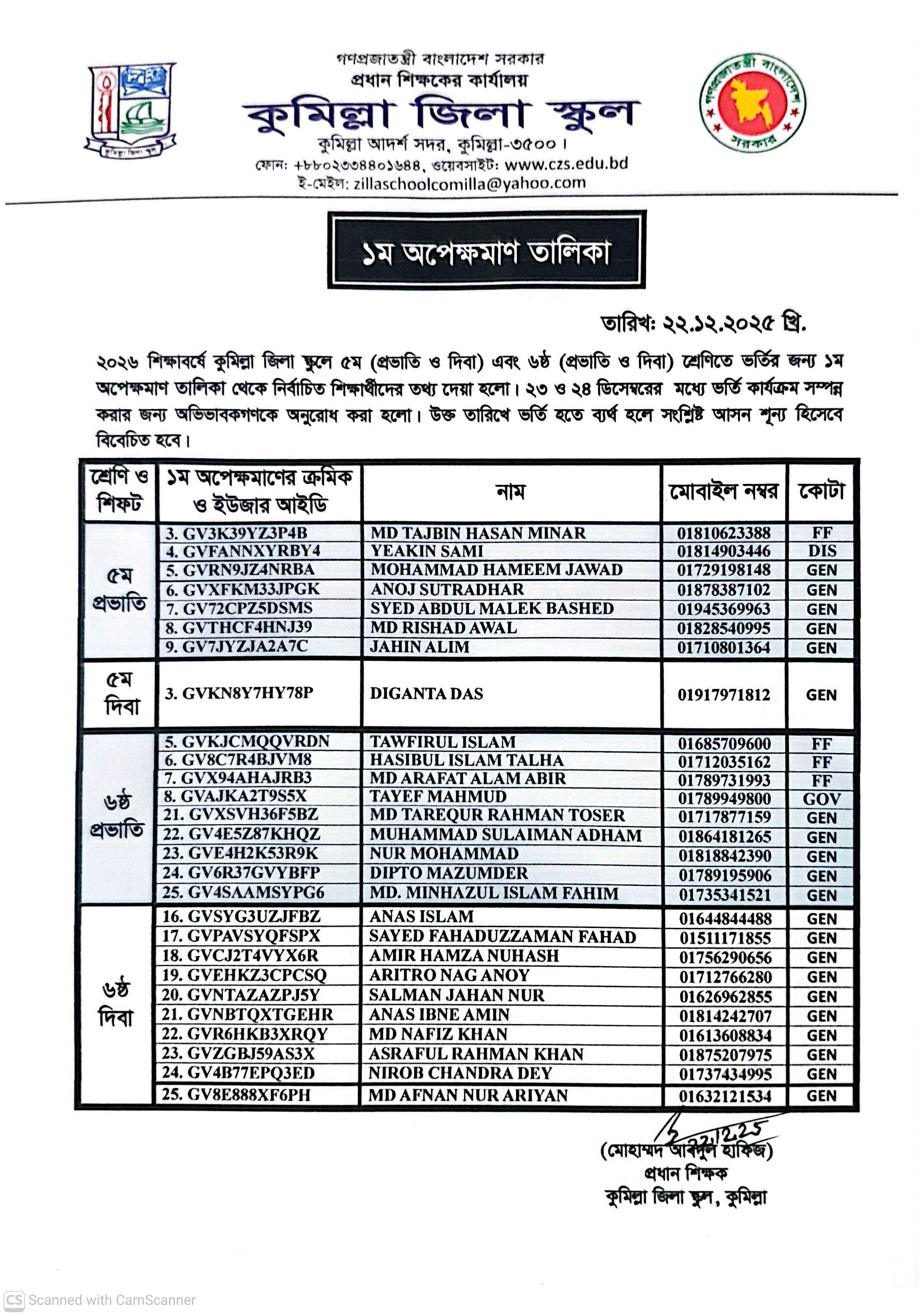 প্রথম অপেক্ষমাণ তালিকা থেকে নির্বাচিত শিক্ষার্থীদের নাম